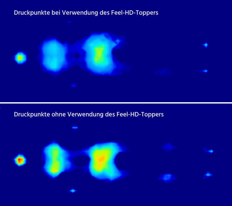CATAS hat den Topper Feel HD speziellen Tests unterzogen, um die Fähigkeit zur Reduzierung von Druckpunkten sowohl in Rücken- als auch in Seitenlage zu prüfen. Die Ergebnisse bestätigen eine hohe Anpassungsfähigkeit des Toppers an unterschiedliche Schlafhaltungen und tragen zu einer gleichmäßigeren Gewichtsverteilung sowie zu verbessertem Liegekomfort bei.